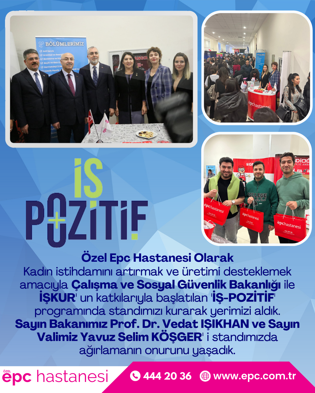 Özel EPC Hastanesi olarak, kadın istihdamını artırmak ve üretimi desteklemek amacıyla Çalışma ve Sosyal Güvenlik Bakanlığı ile İŞKUR’un katkılarıyla başlatılan İŞ-POZİTİF programında standımızı kurarak yerimizi aldık. Sayın Bakanımız Prof. Dr. Vedat IŞIKHAN ve Sayın Valimiz Yavuz Selim KÖŞGER’i standımızda ağırlamanın onurunu yaşadık.